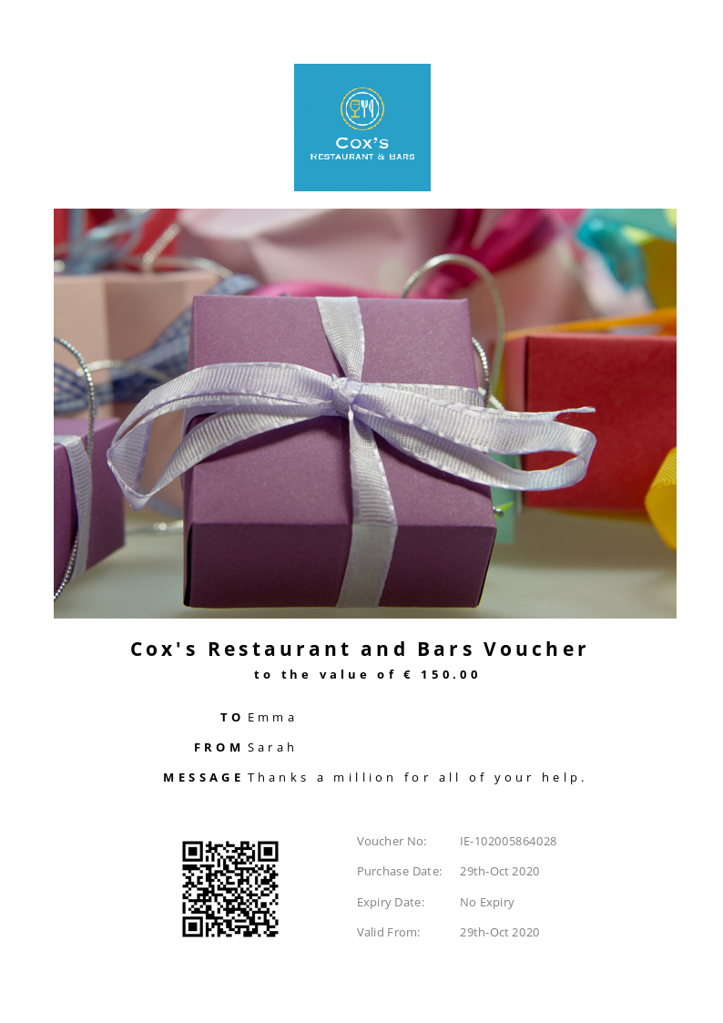 Cox's Restaurant and Bars allows you to purchase instantly printable gift vouchers, special offers and tickets using the Voucher Connect platform.